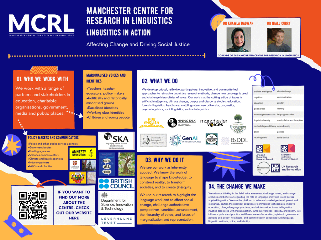 The Manchester Centre for Research in Linguistics is a vibrant centre that sits within the Faculty of Arts and Humanities, with strong links across the University. It is home to a group of researchers who explore language in public and private use. We share a goal of improving communication and understanding between individuals, communities, and wider society through public engagement and knowledge exchange. Our research is rigorous, impactful, transformative and socially relevant to everyday experiences outside of academia.